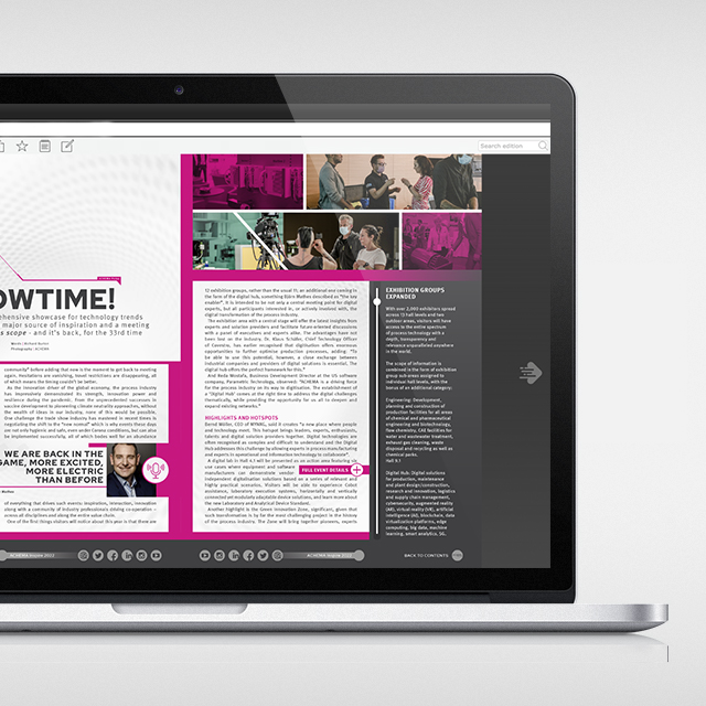 ACHEMA INSPIRE magazines are produced as high-quality, interactive digital publications distributed to the entire global ACHEMA community, including the full database of past visitors who attended ACHEMA events in Europe and China.