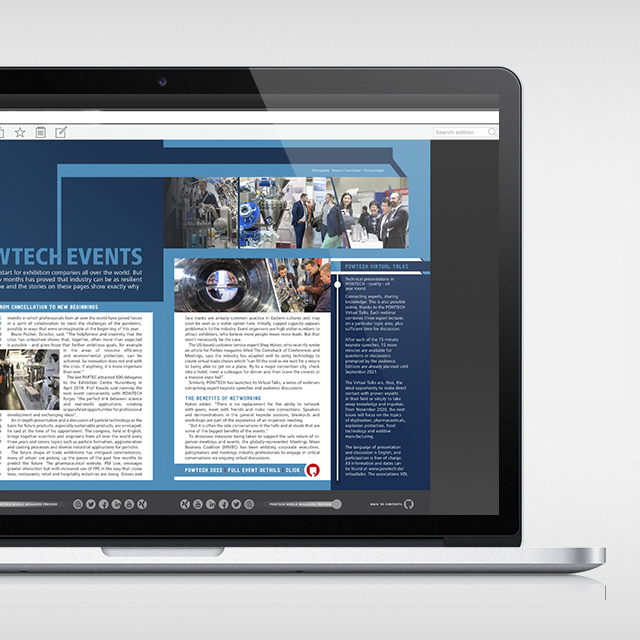 Nuremberg Messe, organisers of Powtech required high-quality digital Powtech World Preview and Review magazines to be hosted online with email links sent to their database of visitors and exhibitors. The magazines are produced to engage with visitors to build interest in, and attendance at, the event. After the fair, the Powtech World Review is a vital source of insight into the event.