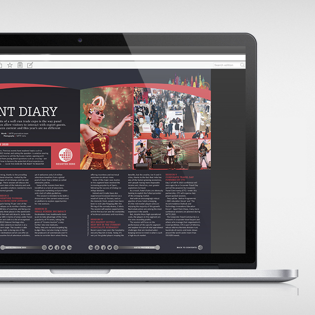 Informa Markets, organisers of SATTE – the South Asia's leading travel show – require high-quality digital SATTE Preview and Review publications to be hosted online with email links sent to their database of visitors and exhibitors. The magazines are produced to engage with visitors to build interest in, and attendance at, the event. After the fair, the SATTE Review is a vital source of insight into the event.